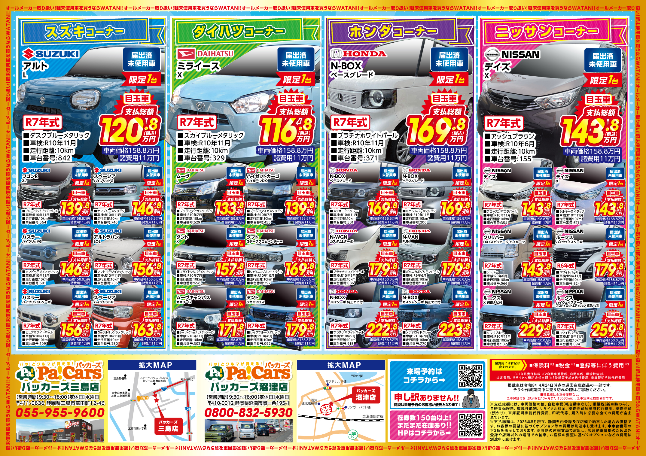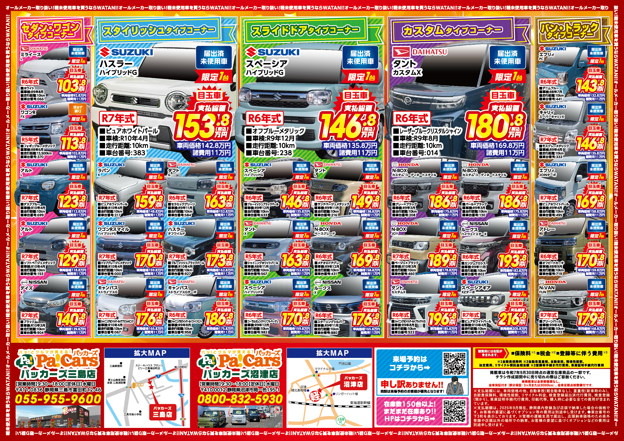 当店は、沼津市・三島市・長泉町・田方郡(函南町)・伊豆の国市・駿東郡(清水町・長泉町)・富士市・伊豆市エリアでもトップクラスの在庫を常時取り揃えています!その数なんと、150台!