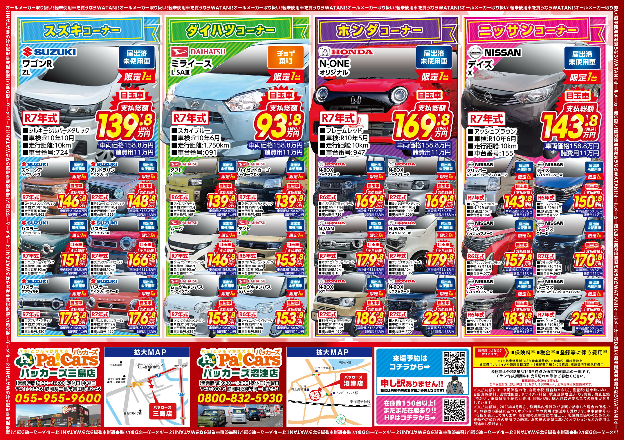 当店は、沼津市・三島市・長泉町・田方郡(函南町)・伊豆の国市・駿東郡(清水町・長泉町)・富士市・伊豆市エリアでもトップクラスの在庫を常時取り揃えています!その数なんと、150台!